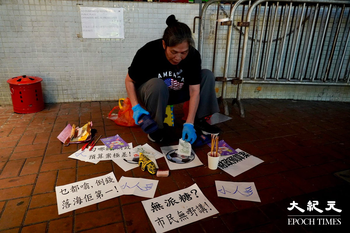 昨日(5日)是二十四節氣中的「驚蟄」,不少市民按傳統到銅鑼灣鵝頸橋底「打小人」。人稱「女長毛」的社運常客雷玉蓮昨日亦到場「打小人」,她在地上放了多張紙,其中兩張上有足球的圖案並寫有「茂波」的字樣,她不斷用黑色膠鞋拍打紙張,批評新一份《財政預算案》「極差」,直言「派糖少少都冇」,更形容是「倒錢落海」。