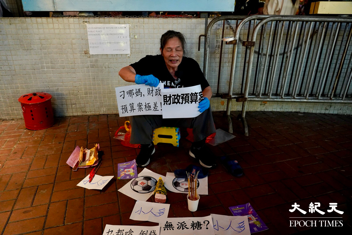 她又提到醫管局的收費改革下急症室部份收費加價,「市民去輪急症室要四、五百,我哋基層市民真係好陰功」,更不滿在場戒備的警員一直拍攝她「打小人」的行動。期間她進行「燒衣」,包括將《財政預算案》放入鐵桶焚燒,期間一度被灣仔分區的便衣警員「提醒」,警員稱擔心「燒嘢危害到其他人,咁勸喻你唔好燒啦」。@
