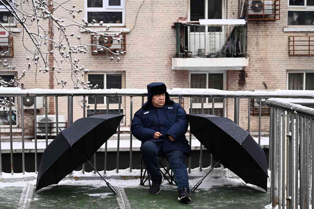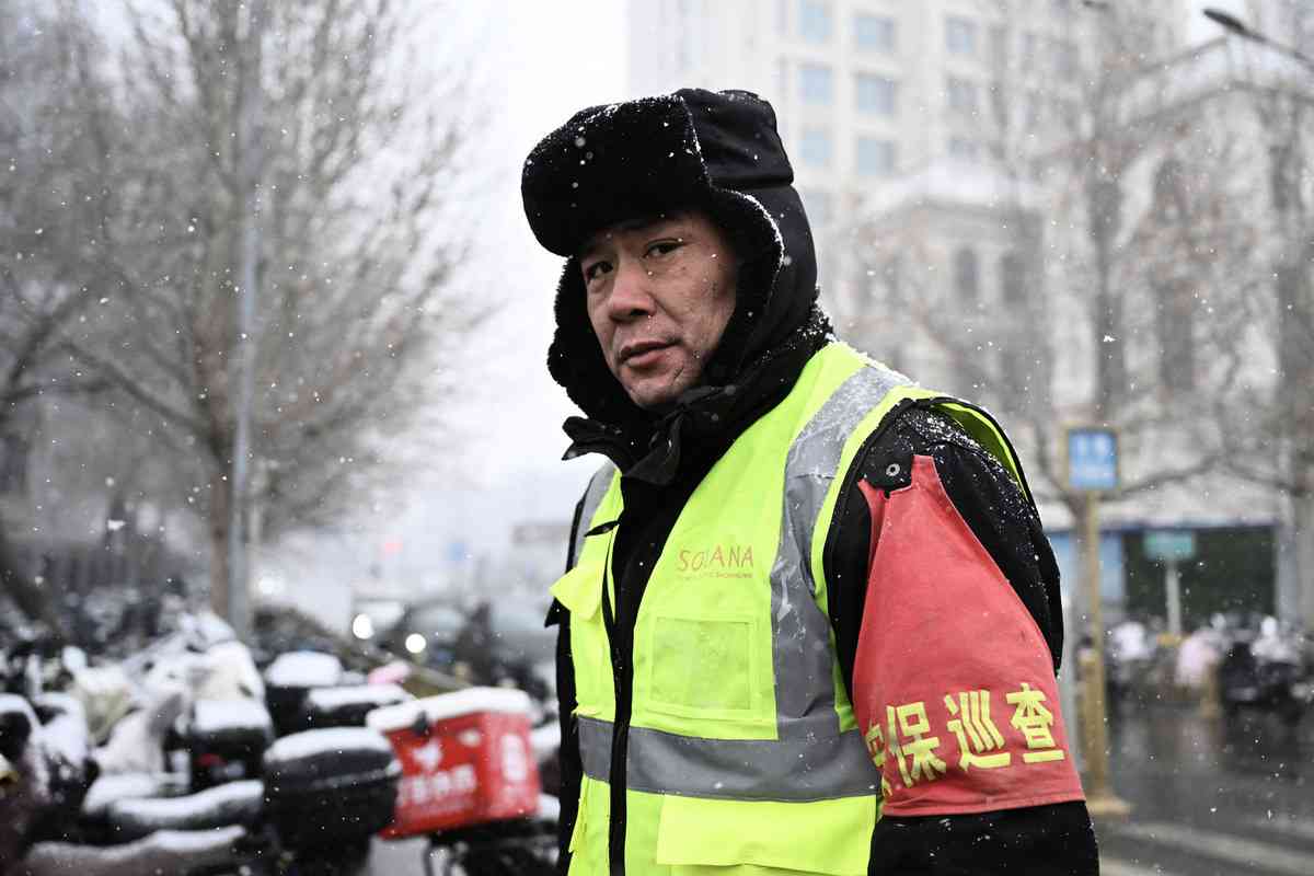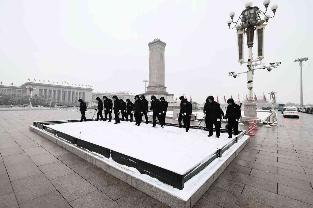 3月4日,北京忽然降雪,儘管外人很難靠近大會堂和天安門廣場,但兩會保安們仍被要求檢查積雪下面是否可能藏有危險品,畫面相當另類。