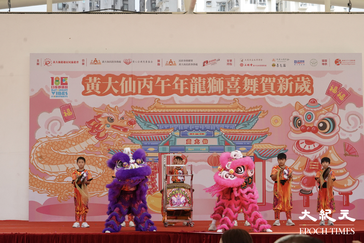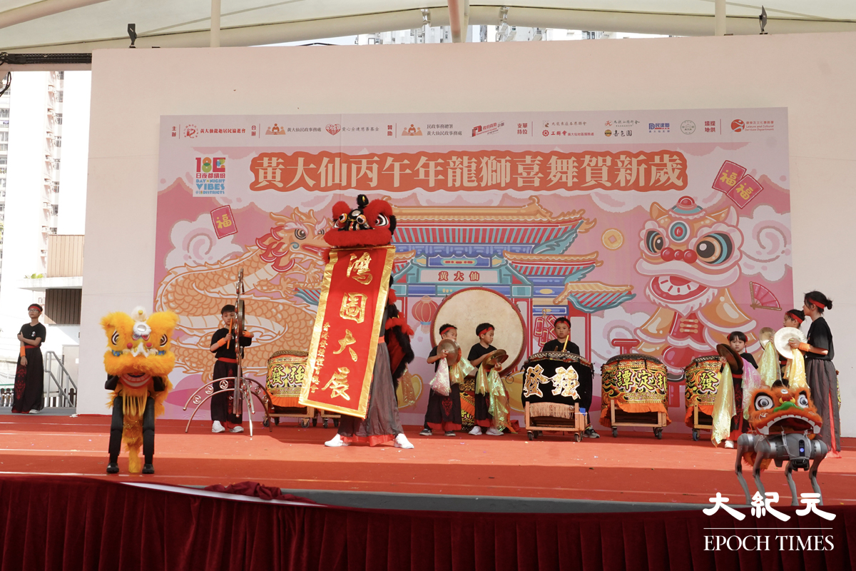 黃大仙廣場今午(7日)舉辦「黃大仙丙午年龍獅喜舞賀新歲」活動,除傳統醒獅表演之餘,更引入機械醒獅,兩者相互配合增添新鮮亮點。同場亦有舞龍活動。