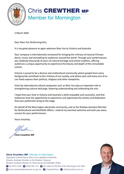 維州議會自由黨黨鞭、影子助理財長克魯舍議員(Chris Crewther MP)在信中表示:「親愛的神韻藝術團,再度歡迎神韻蒞臨澳洲及維州,我們深感榮幸。」