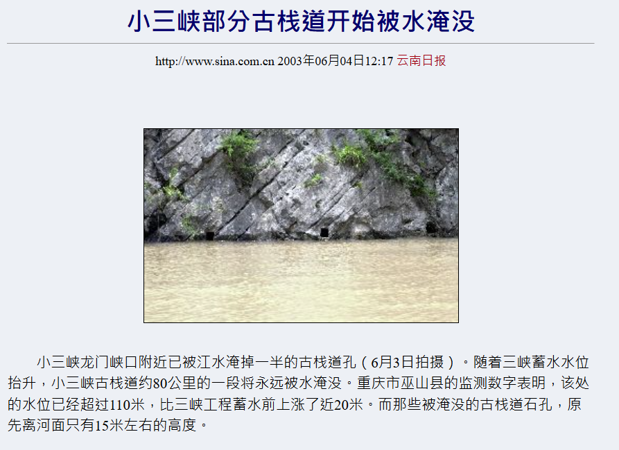 三峽棧道絕大部份已經被庫水淹沒。幸運的遊客也許能看到一些古棧道的的洞孔。
