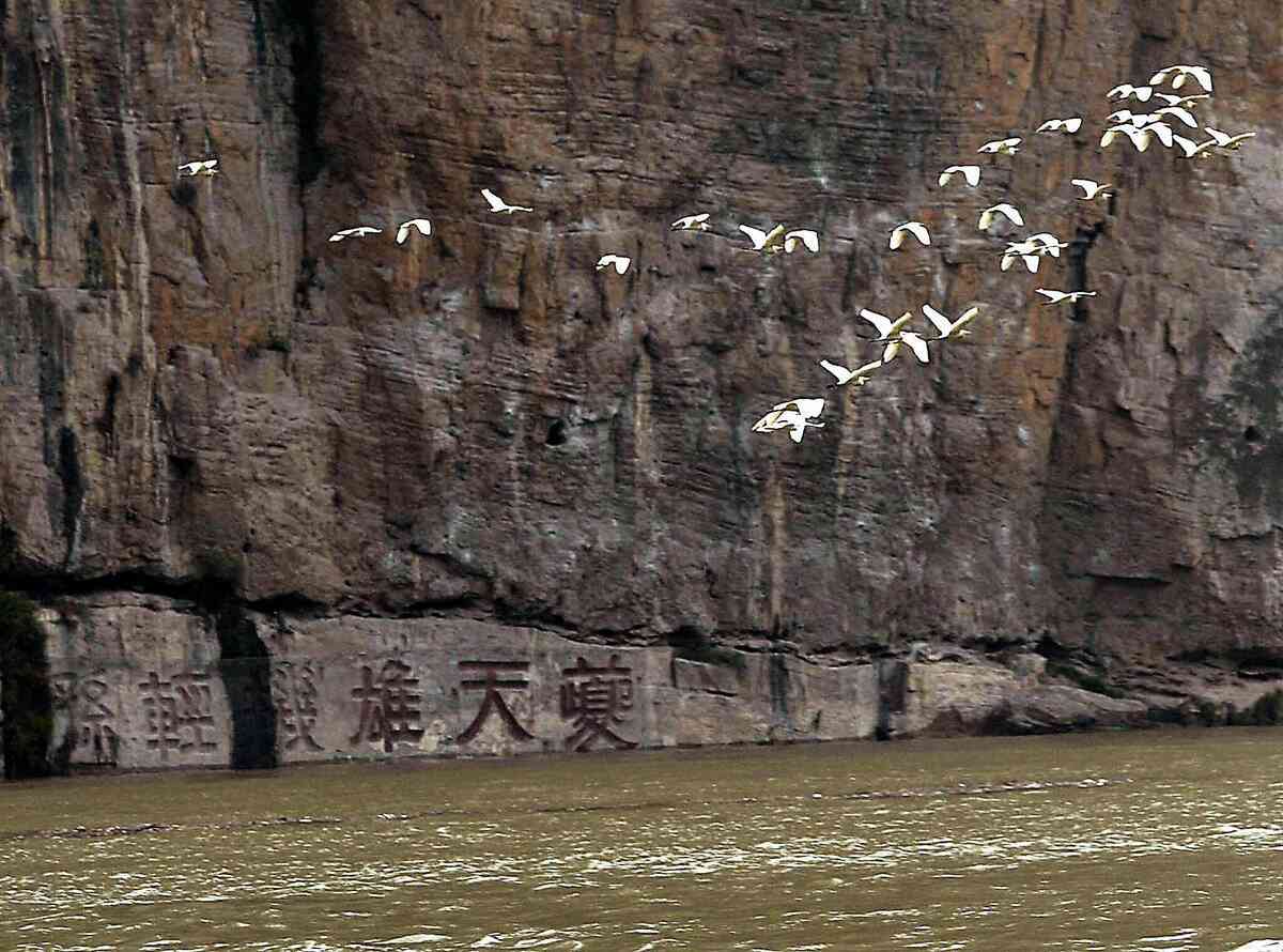 瞿塘峽兩岸岩壁上有許多名人的題刻,其中民國將領孫元良將軍的「夔門天下雄,艦機輕輕過」題刻,每個字高達3.35米。現已被庫水淹沒。