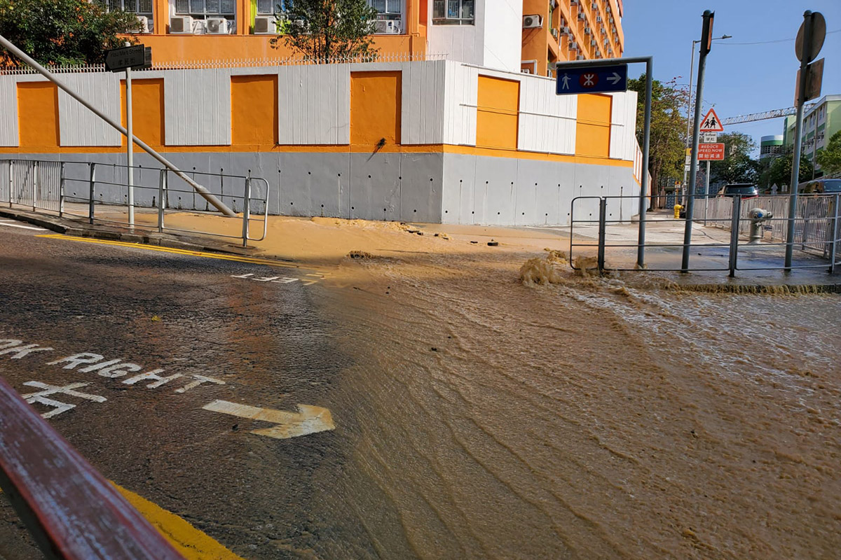 現場消息指,受影響範圍約10米乘4米。泥水亦流至愛民廣場對開馬路,途經巴士需涉水而行。警方接報到場後封鎖相關路段,並通知水務署派員關閉水掣及搶修。
