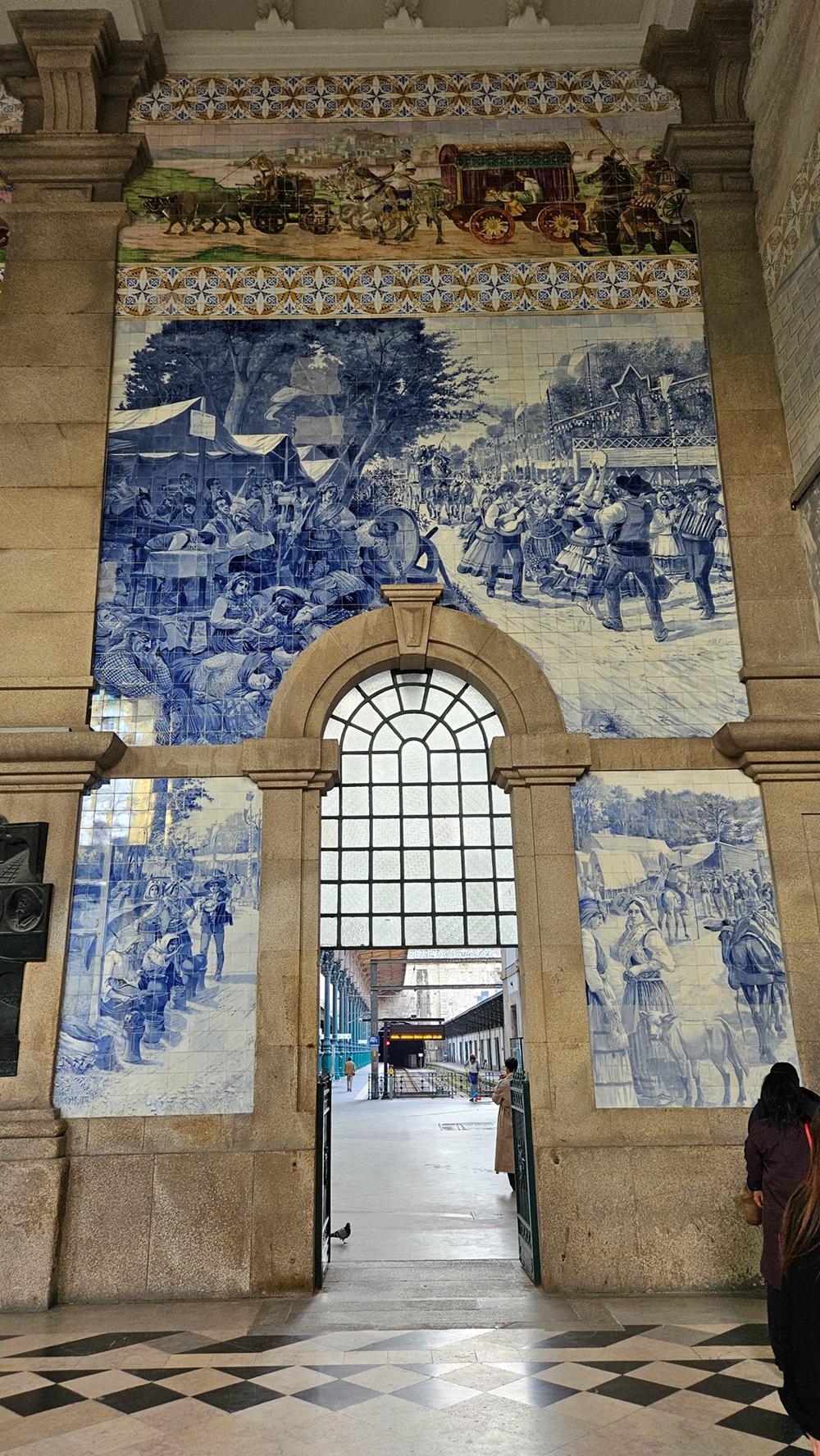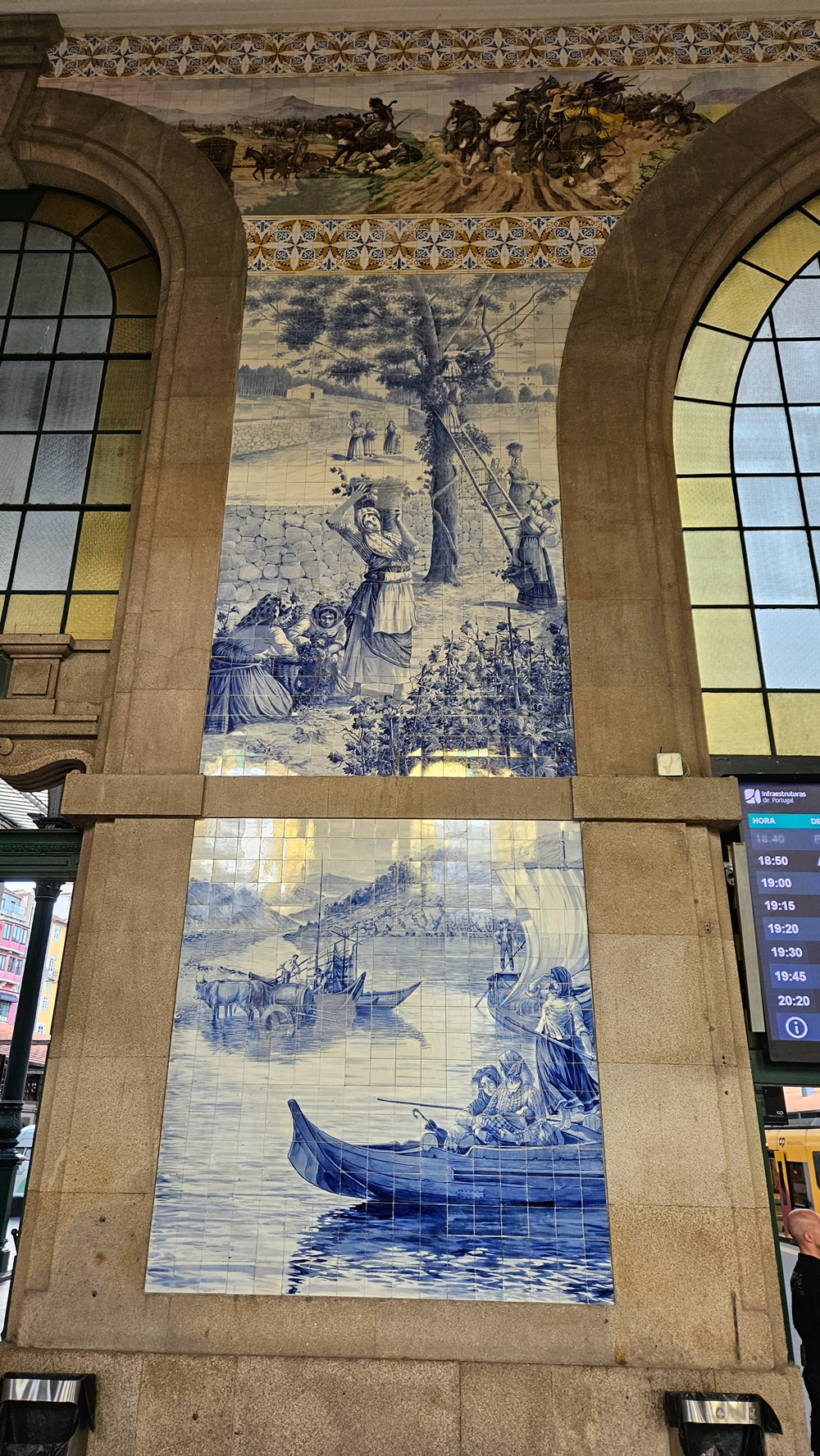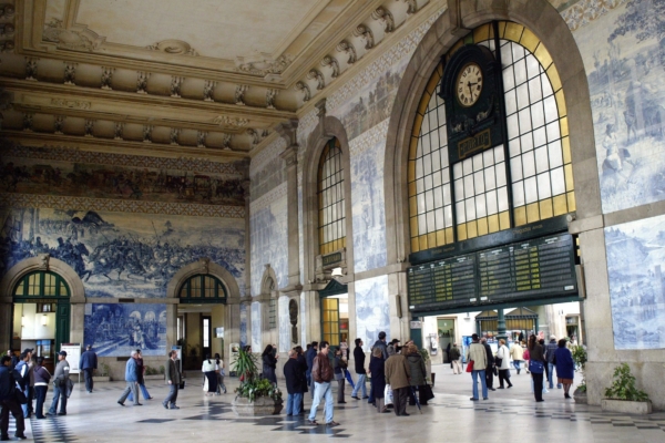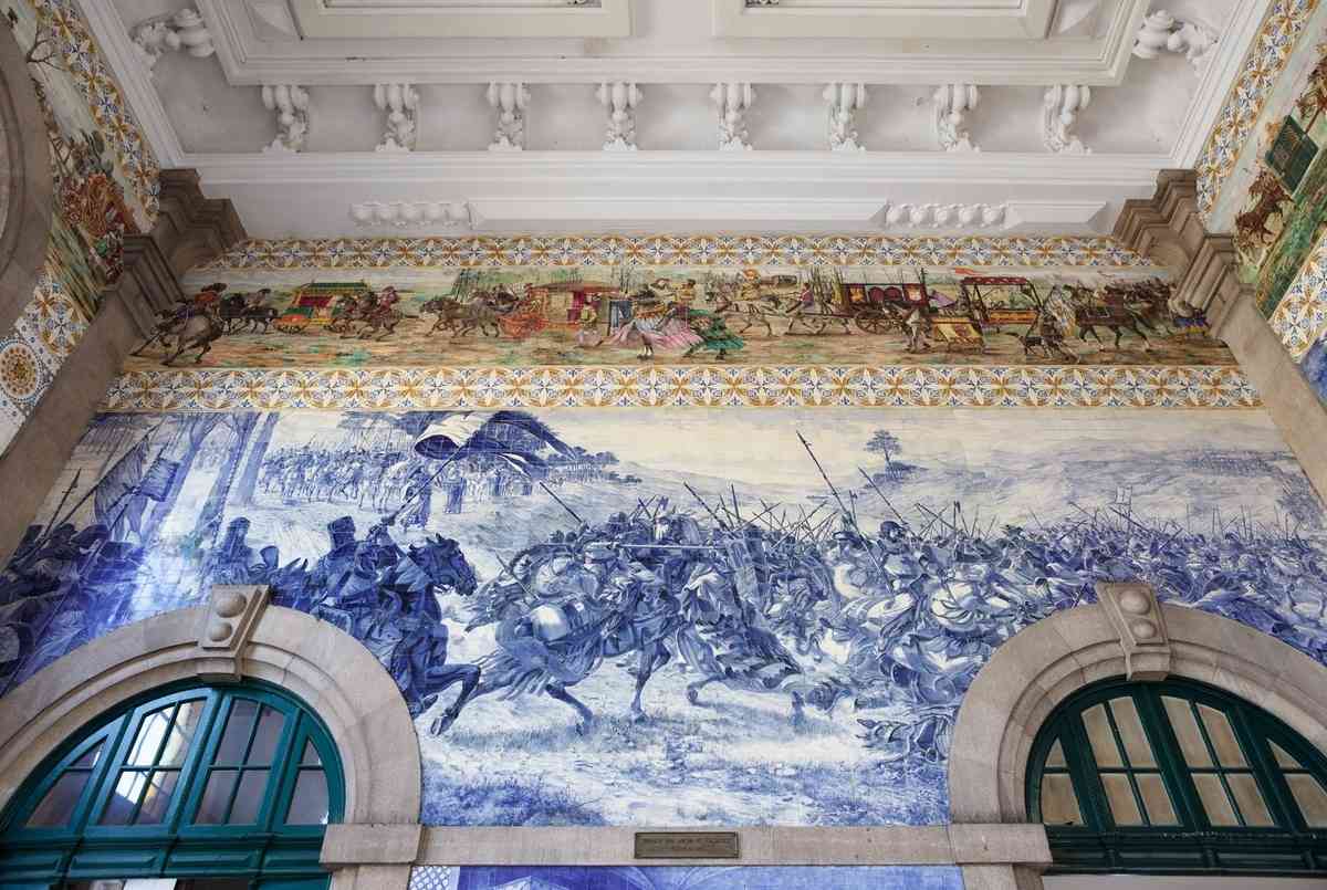 這種藍白相間的瓷磚畫是葡萄牙和西班牙特有的藝術風格,稱為阿茲勒赫瓷磚畫(Azulejo)。在車站裏面來來去去的旅客,經過巨幅藍白瓷磚畫都會不自覺地停下來欣賞。徜徉其中,會誤以為來到一座風格獨特的美術館,聖本篤車站也因此被譽為世界最美火車站之一。