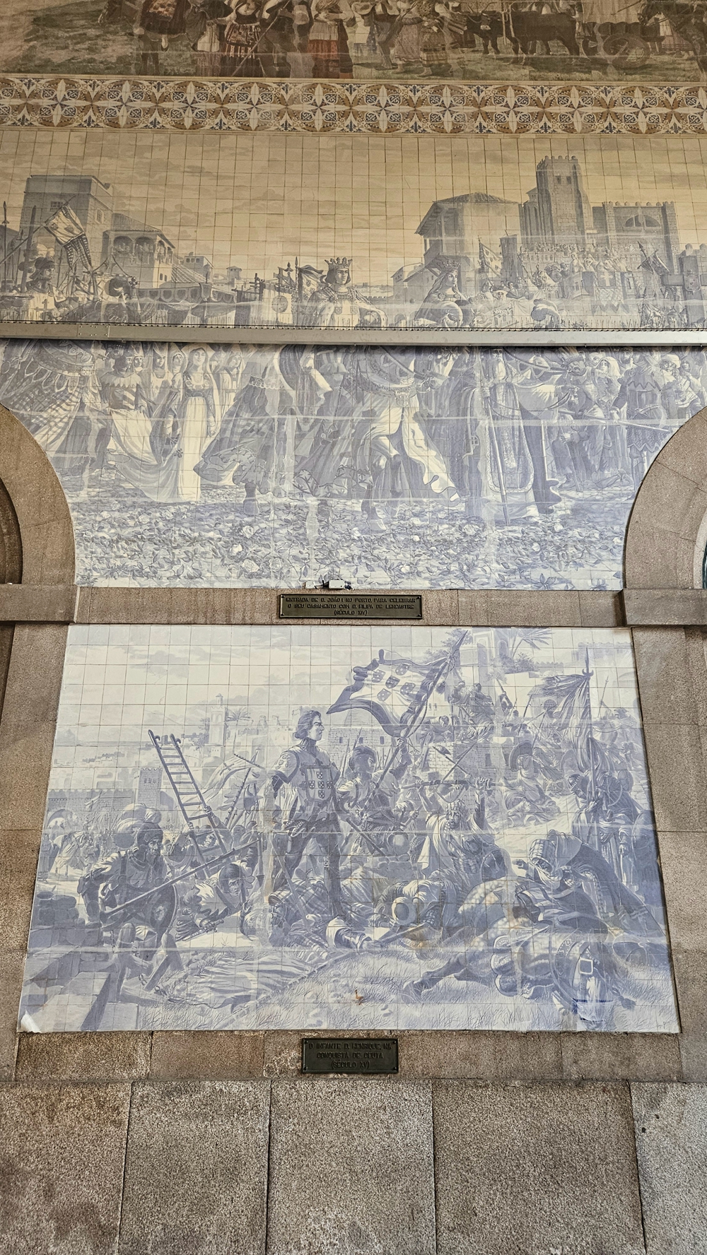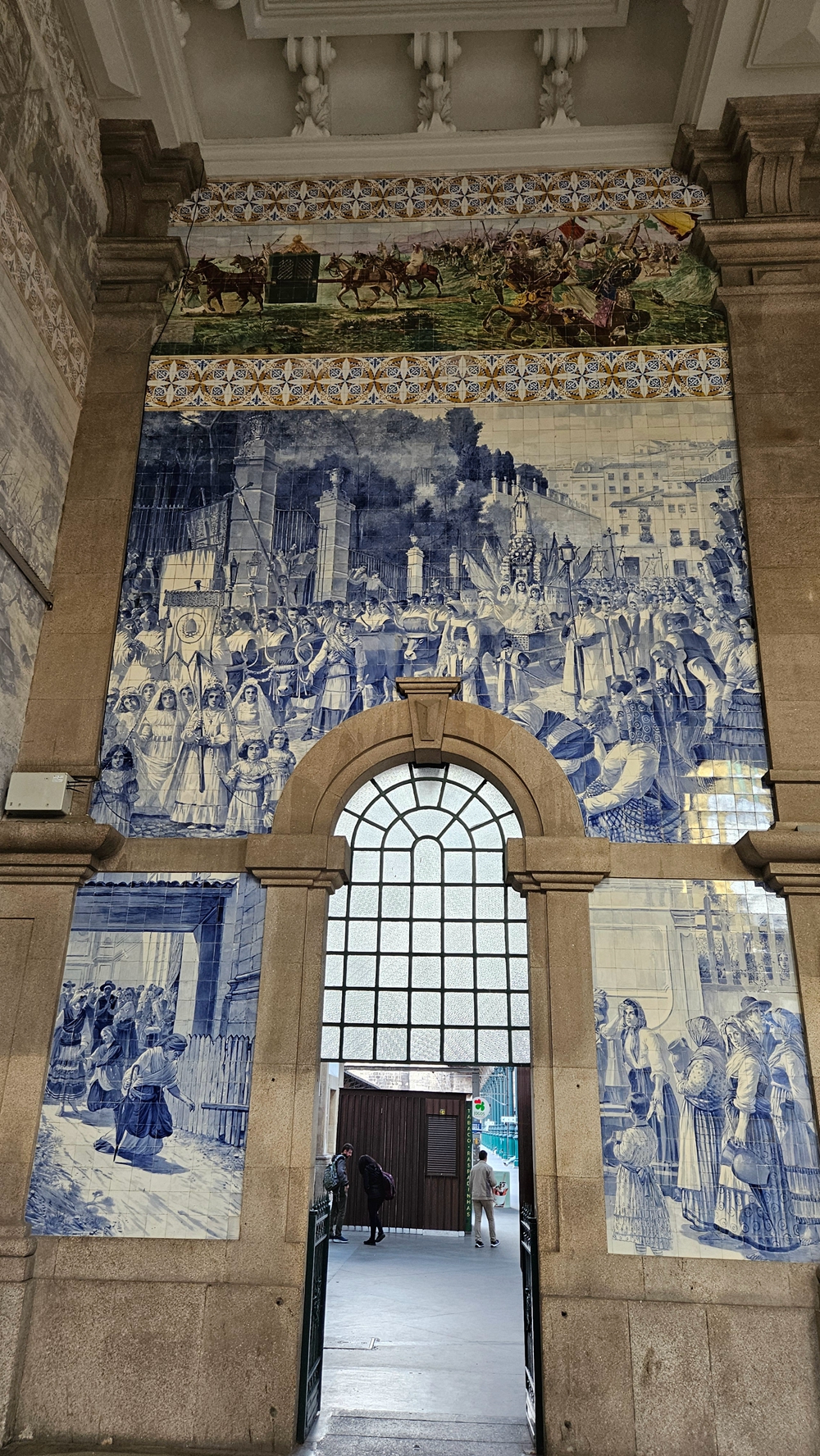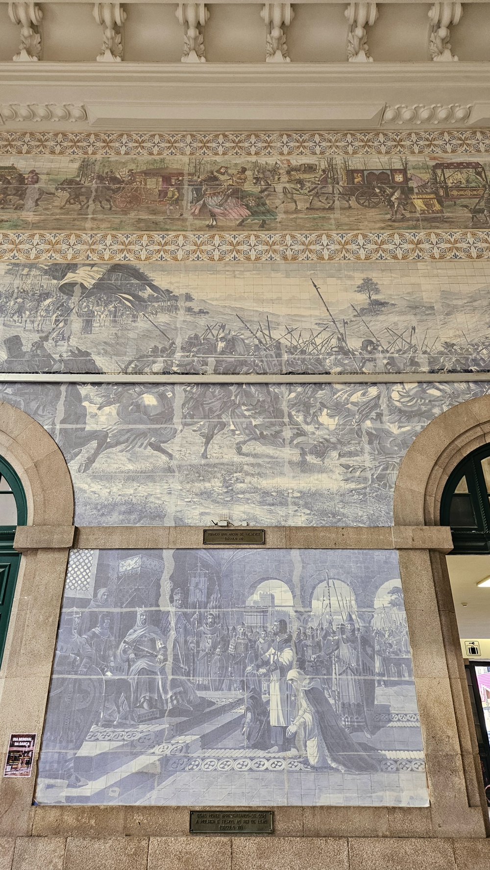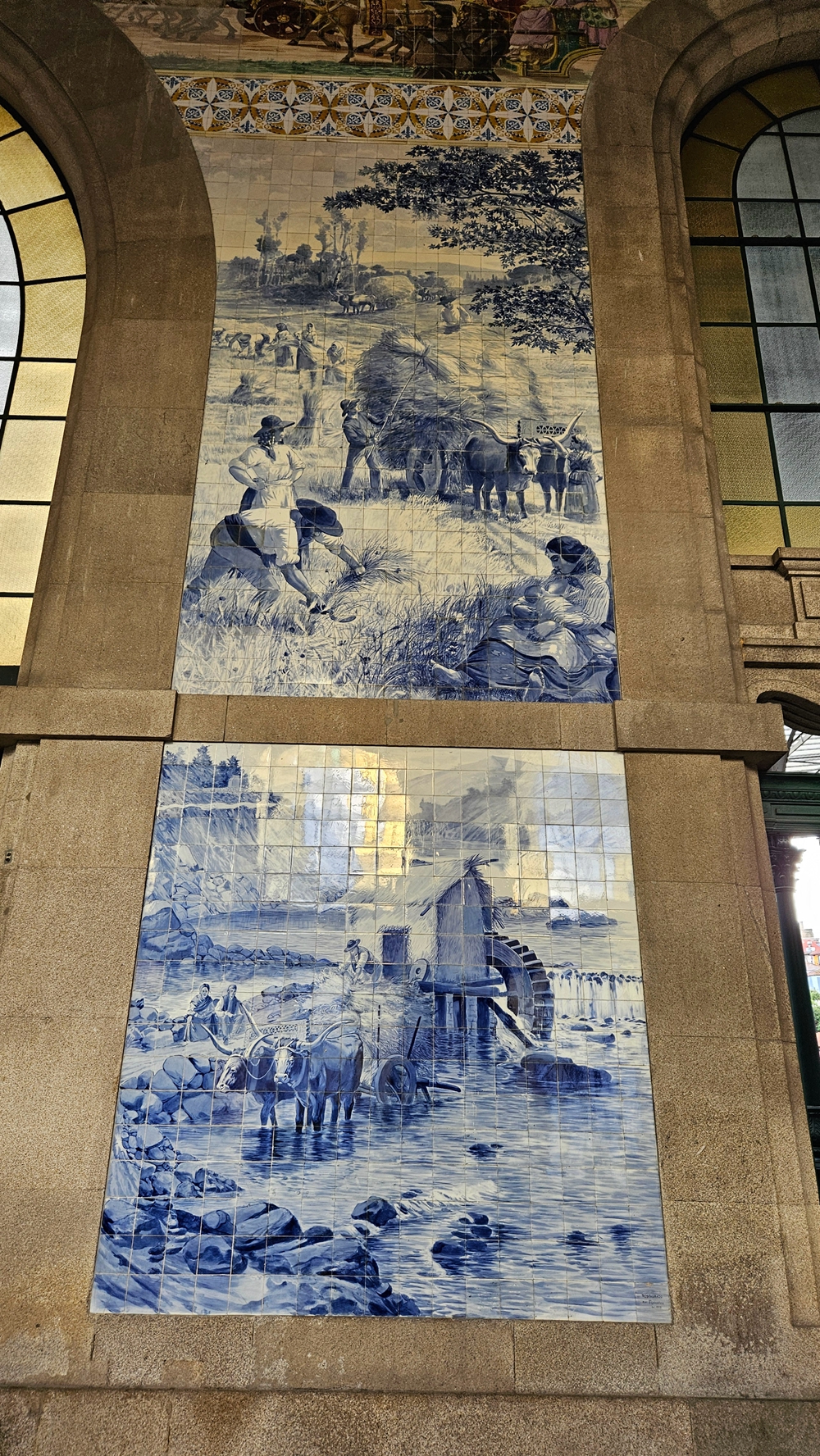這種藍白相間的瓷磚畫是葡萄牙和西班牙特有的藝術風格,稱為阿茲勒赫瓷磚畫(Azulejo)。在車站裏面來來去去的旅客,經過巨幅藍白瓷磚畫都會不自覺地停下來欣賞。徜徉其中,會誤以為來到一座風格獨特的美術館,聖本篤車站也因此被譽為世界最美火車站之一。