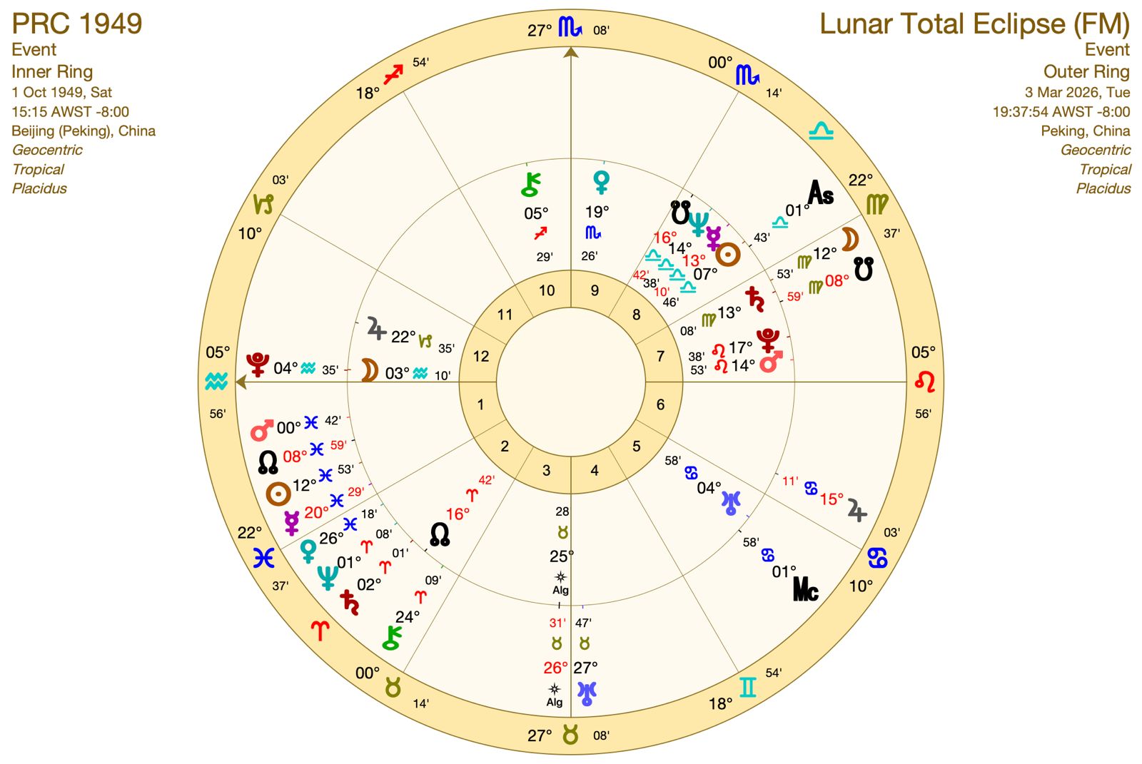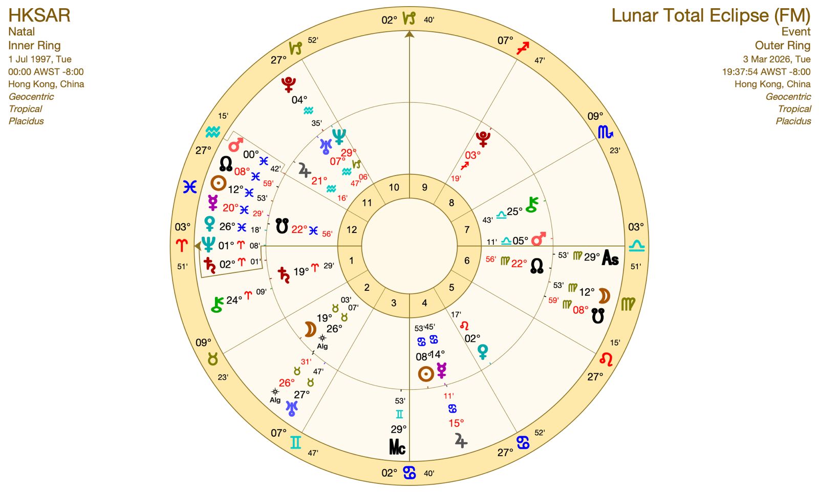 透過內盤本命(國家)盤與外盤月蝕盤合盤分析,3月3日的月全蝕對兩地運勢帶來的觀察如下:
