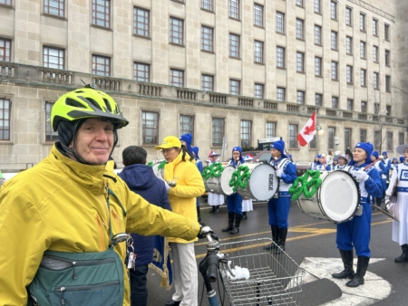 由60位來自滿地可和渥太華的法輪功學員組成的天國樂團參加了當天的遊行。樂團演奏了八支曲目,引來兩側的觀眾不斷鼓掌和稱讚。