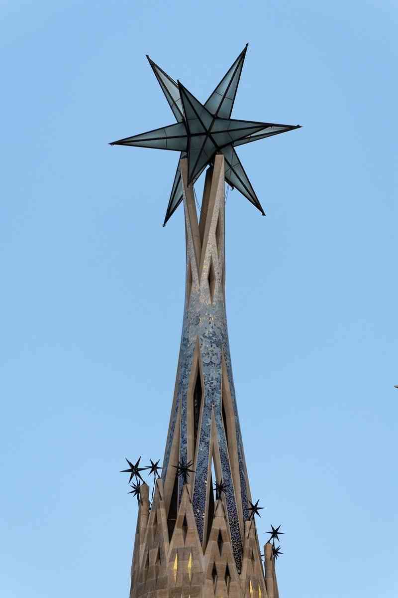 聖家堂的聖母瑪利亞塔(tower of the Virgin Mary),攝於2025年11月17日。該塔於2021年落成,高138米,是這座教堂中僅次於耶穌基督塔的第二高塔。其塔頂配有一顆閃耀的12角星,象徵伯利恆之星,展現了高迪有機的設計風格。(Josep LAGO/AFP via Getty Images)