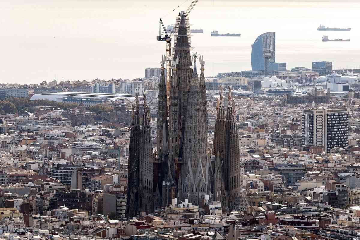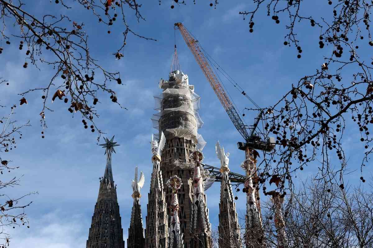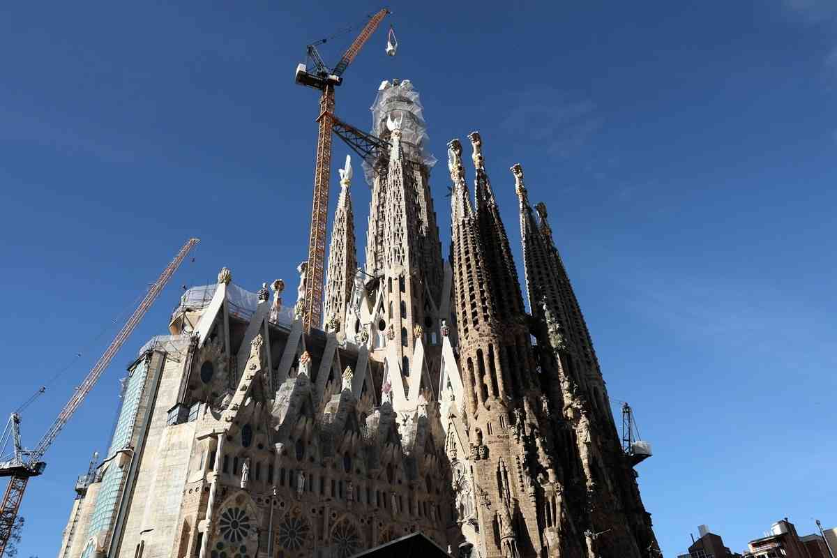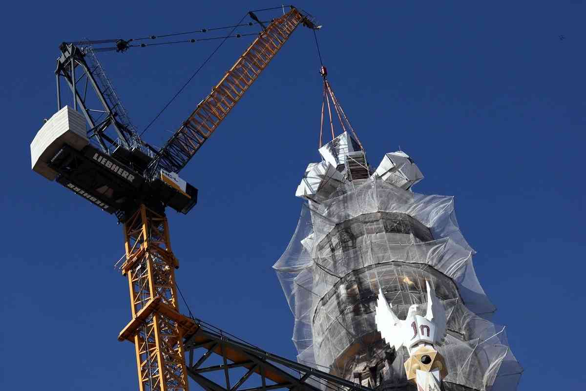2026年2月20日,施工人員利用起重機,將十字架的最後一個部件安裝在「耶穌基督塔」的塔頂,聖家堂宣告正式封頂。(Lluis GENE/AFP via Getty Images)