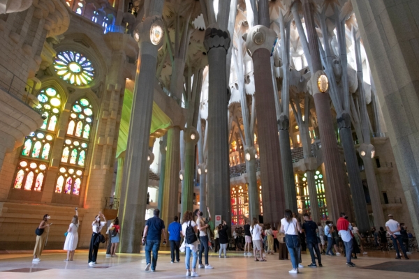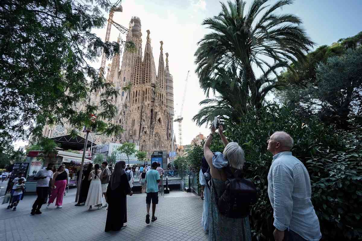 2025年8月2日,遊客參觀位於巴塞隆拿的聖家堂並拍照留念。(Manaure QUINTERO/AFP via Getty Images)