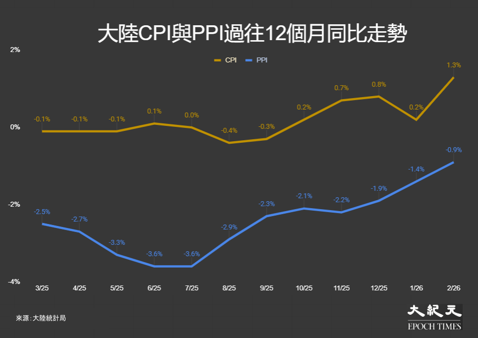 大陸統計局於9日公布最新居民消費價格指數(CPI),2月份環比錄得通脹1.0%,同比報1.3%,超出市場預測的0.8%,1月按年僅走高0.2%;本月數值創自2023年1月以來最高,某程度上反映今年在2月過年的基數影響。然而,3月油價急升至上破每桶100美元(布特蘭原油目前報每桶115.5美元),料將推高3、4月的物價走勢。