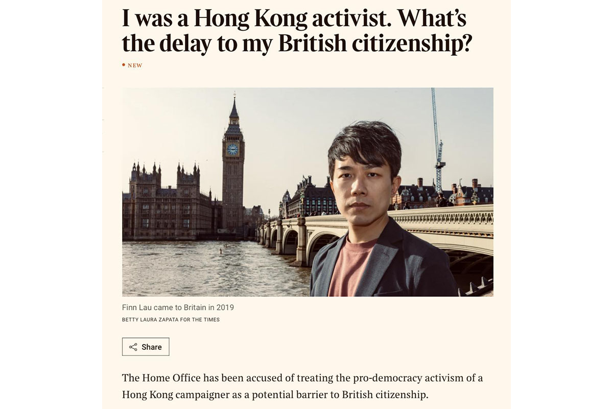 他向《泰晤士報》表示,擔心其英國公民申請會被拒,「甚至可能永遠不會獲批公民身份,雖然我沒有做錯事」。他認為,如果其公民申請遭拒,其他在英港人都會感到不安。