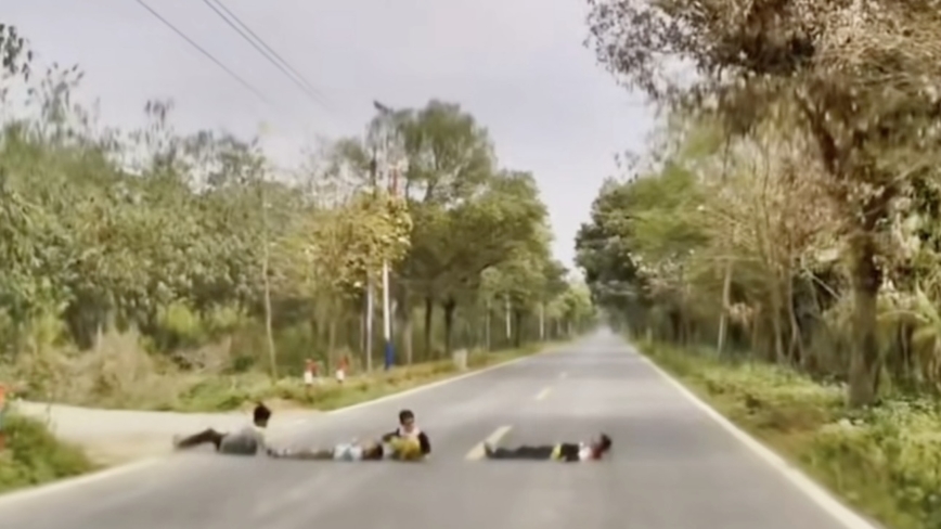 3月8日,在廣東清遠一條縣級公路上,四名兒童在馬路中間排成一列趟地「cos減速帶」(路拱),一輛汽車經過時緊急煞車,所幸未釀成事故。