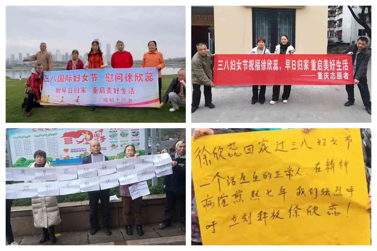 3月8日是國際婦女節,大陸長期關注「被精神病」群體的志願者發起守護送暖活動。來自重慶、成都、無錫、恩施四地的志願者,以拉橫額等方式向被關押在成都市德康醫院的婦女徐欣蕊以及處在「被精神病」困境中的女性,送上節日祝福及深切的關懷。