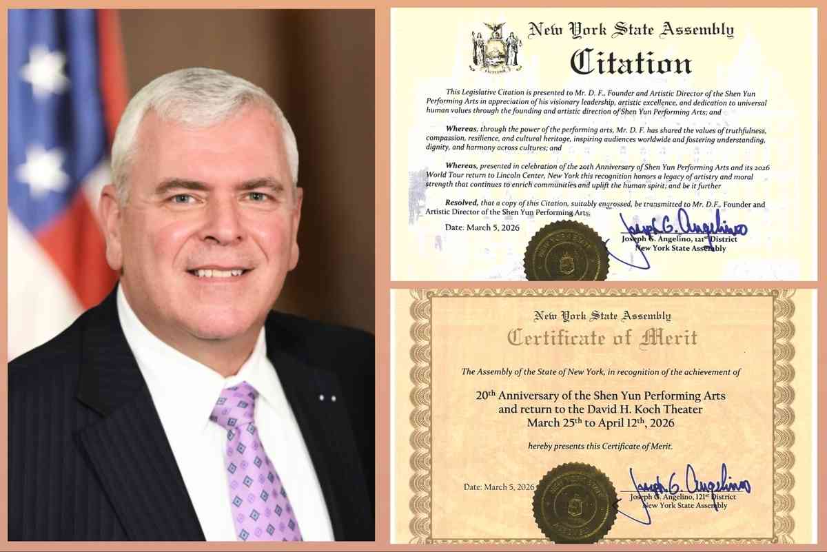 美國神韻藝術團將於3月25日至4月12日重返紐約市大衛寇克劇院,帶來2026年全新鉅獻。近日,紐約州第121選區共和黨州眾議員Joseph G. Angelino頒發兩份表彰狀,一份頒發給神韻藝術團創辦人兼藝術總監D.F.先生,以向其在藝術領域的卓越貢獻以及通過藝術弘揚普世價值並啟迪全球觀眾而致敬;另一份褒獎祝賀神韻藝術團成立二十周年及在紐約市大衛寇克劇院的年度演出。