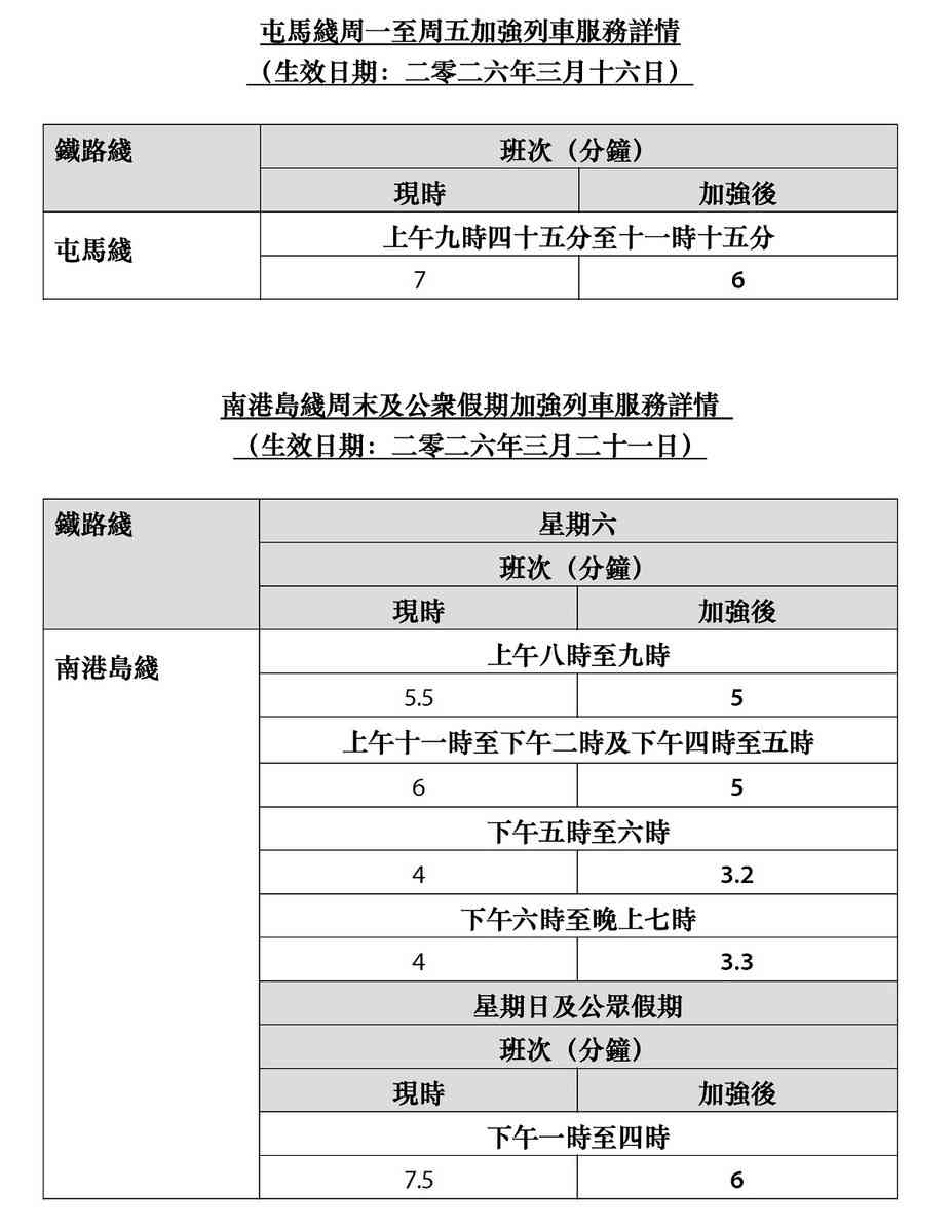 另外,近年南港島綫沿綫社區持續發展,為配合沿綫人口的增長及出行模式,南港島綫會由3月21日(下星期六)起加密周末及公眾假期的班次,大部份時間的列車服務均會有所加強,例如下午會加密至約3至6分鐘一班車。@