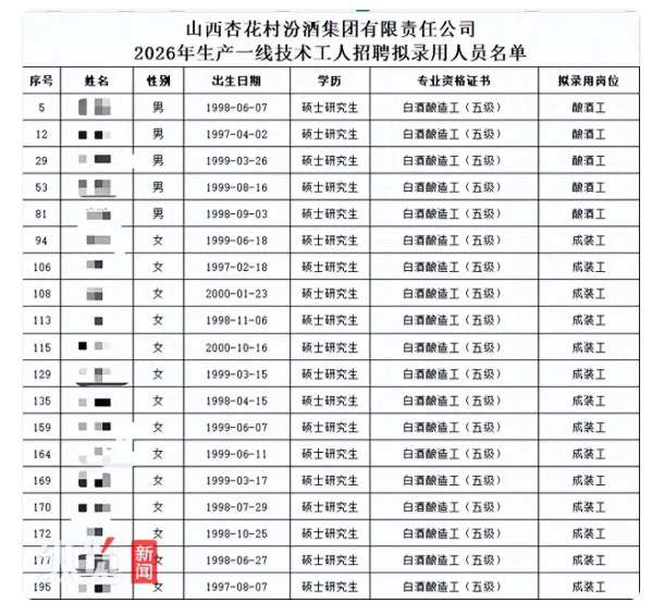 汾酒集團3月9日發布了2026年生產一線技術工人招聘擬錄用人員名單。其中有十多名碩士研究生被錄用為釀酒工和成裝工,這些一線工作崗位是體力勞動者。該消息3月10日經中國多家媒體報道後,引發了網民關注和爭議。諸如「用鐵鍬攤晾、撒曲需要這麼高的學歷嗎?」的質疑聲,紛紛響起。