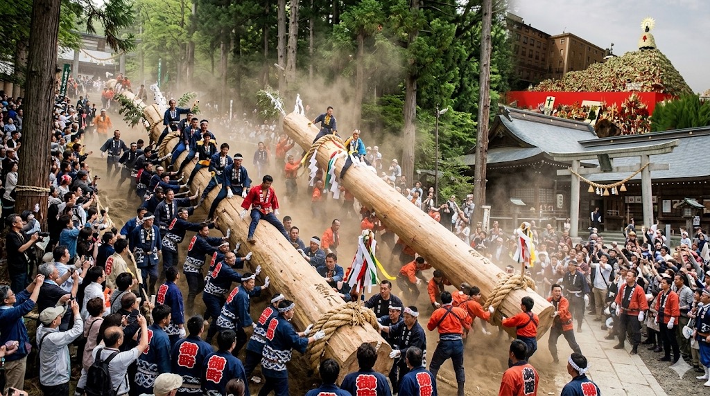 長野縣諏訪市的「御柱祭」,有一千二百多年的歷史,據傳自平安時代初期便開始舉辦。室町時代的文獻《諏訪大明神畫詞》中,留存著最早的相關記載。其起源與由來雖未詳細記載,但從中可看出,自古以來,在諏訪大社舉行諸多神事中,「御柱祭」是規模最大、最為重要的一項神事。
