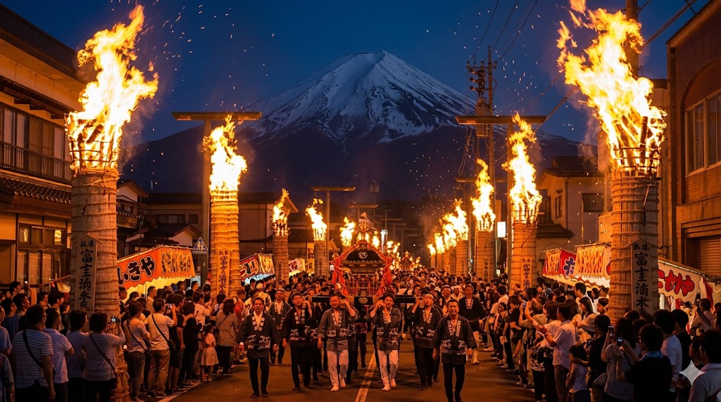 在此期間,還要舉行神輿巡行。人們抬著神輿從北口本宮富士淺間神社出發,穿過火把街道,象徵神靈巡行鎮護。