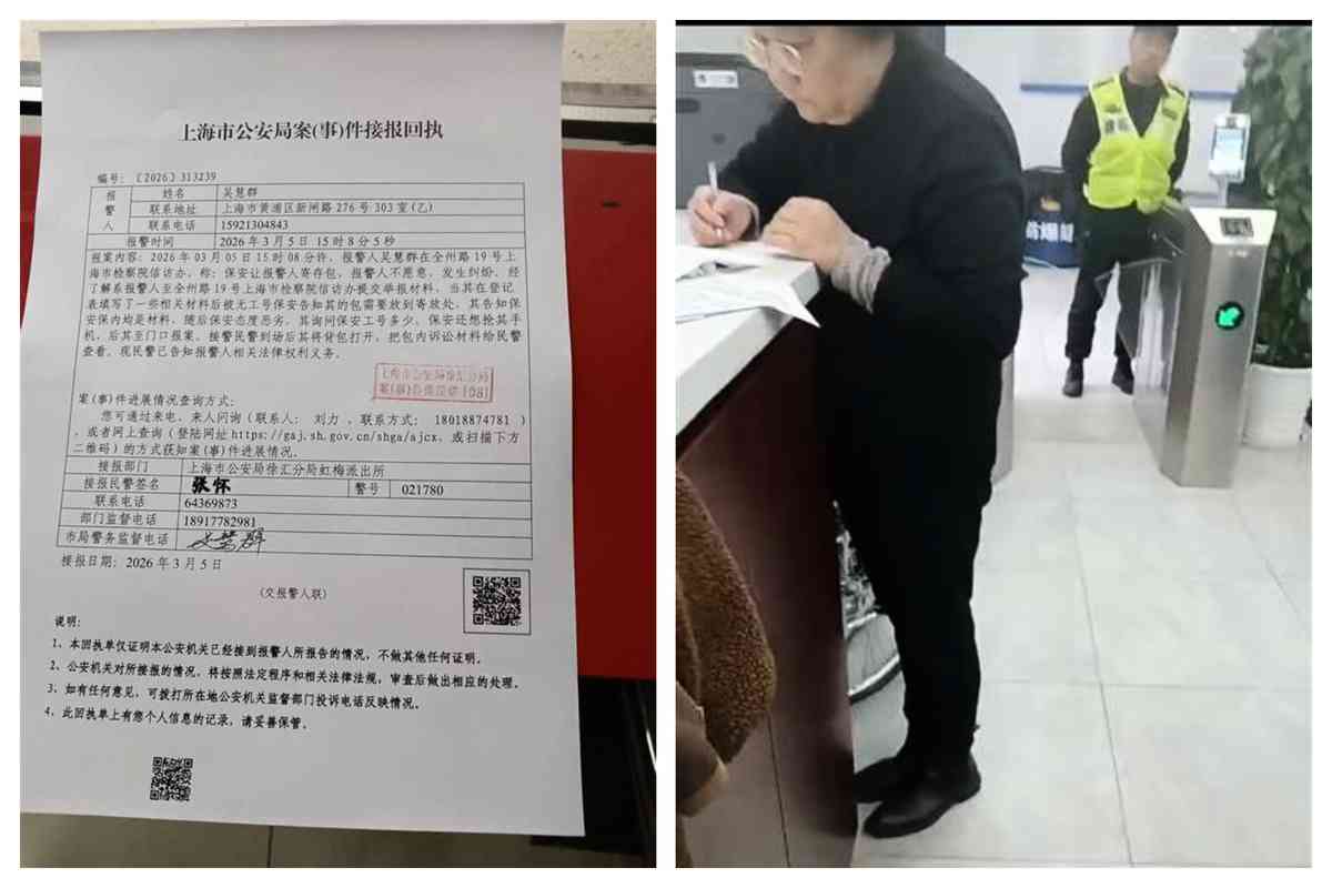 吳慧群告訴大紀元記者,3月5日下午3點左右,她來到上海市檢察院信訪辦欲投訴她的冤假錯案。當她通過安檢正在填寫投訴登記表時,突然一名無工號的黑衣人說,她的包要放在寄放處。因她包裏都是投訴的材料,所以沒同意。