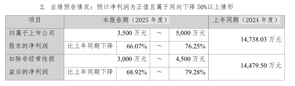 另據「歡樂家」之前發布的《2025年度業績預告》顯示,公司預計2025年實現歸母淨利潤3500萬元~5000萬元,同比下滑66.07%~76.25%;實現扣非淨利潤3000萬元~4500萬元,同比下降68.92%至79.28%。