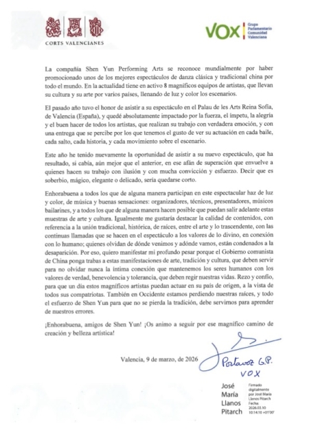 2026年3月9日晚,他在瓦倫西亞的索菲亞王后藝術歌劇院觀看了美國神韻紐約藝術團的演出後,對神韻讚歎不已,並致信神韻西班牙主辦方,以表達他的敬佩和感謝。