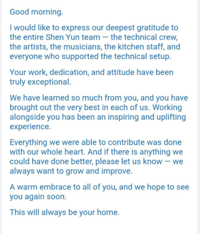 我們想向整個神韻團隊表達最深的感謝——包括技術團隊、藝術家、音樂家、餐廳工作人員,以及所有支持技術搭建工作的每一位。