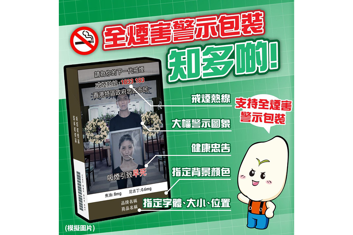 醫務衞生局昨日(12日)表示,政府暫計劃於明年第二季,同步全面實施傳統吸煙產品統一包裝設計和完稅標籤制度。屆時所有合法銷售的指明煙草,必須貼有完稅標籤。