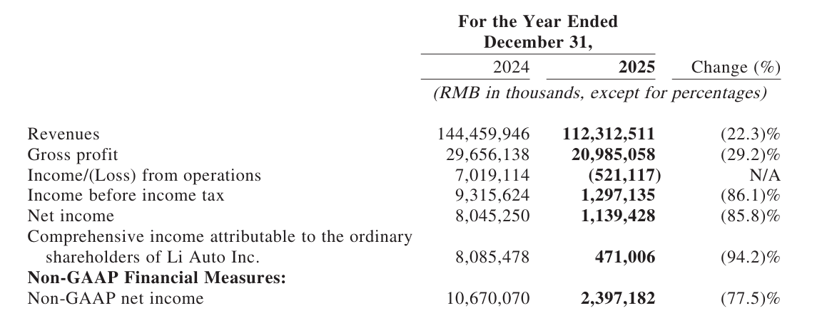 3月12日,中國新能源車企「理想汽車」發布的2025年公告顯示,2025年其營收和淨利雙雙下滑,其中,歸屬於普通股股東的淨利潤同比下降85.8%。