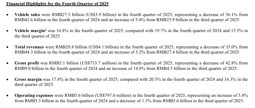 12日,理想汽車發布了2025年第四季度財報和2025年財報。據《截至2025年12月31日止年度的年度業績公告及公司章程擬議修訂》公告顯示,理想汽車實現營收1,123.12億元(人民幣,下同),同比下降22.3%;歸屬於普通股股東的淨利潤為11.39億元,同比下降85.8%,車輛毛利率為17.9%,而2024年同期則為19.8%。
