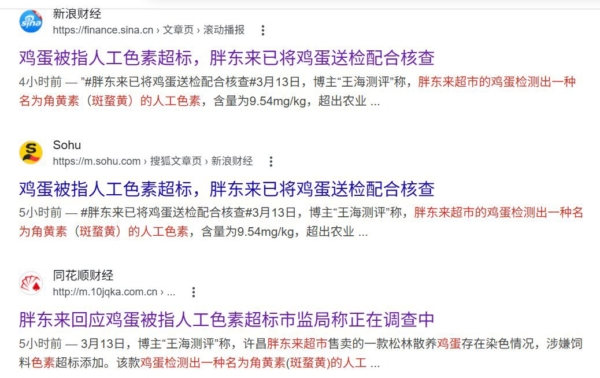 3月13日,大陸有測評博客「發布影片稱,在許昌胖東來超市購買的『野跡鳴松林散養富硒蛋』中檢出人工色素角黃素,含量為9.54mg/kg。博客以農業農村部《飼料添加劑安全使用規範》中蛋禽類飼料斑蝥黃最大添加量8mg/kg為依據,認定該雞蛋色素「超標」,涉嫌飼料色素超標添加,並存在一定食用安全隱患。該影片迅速傳播,並登上熱搜。
