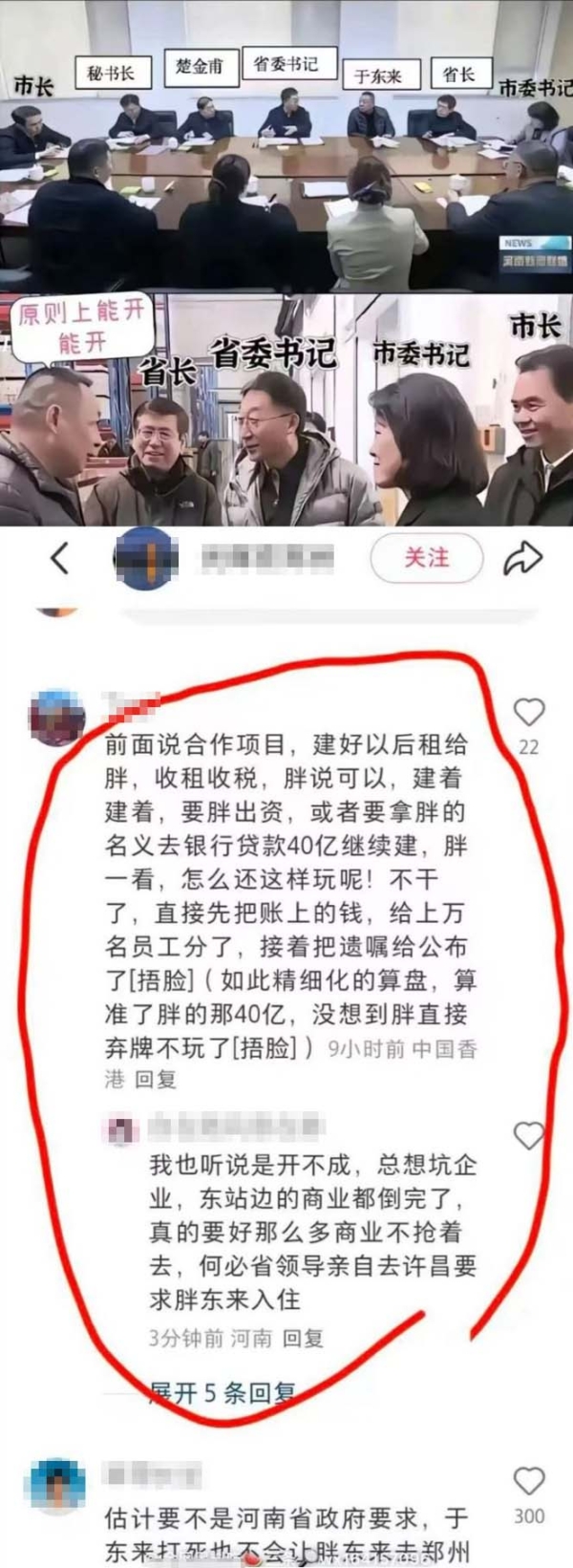 網上有爆料者稱,河南省和鄭州市的一把手親自出面,拉于東來開設首家鄭州分店。說好由政府出資建設商業廣場,然後將場地租給胖東來。但項目建到一半,當局突然以「資金不足」為由,讓胖東來自己出資建設,擺明了就是要收割胖東來的財產。當局的算盤是,胖東來自己建設廣場,門店進駐以後,地方當局再利用胖東來的名氣拉動周邊的商業和房地產。