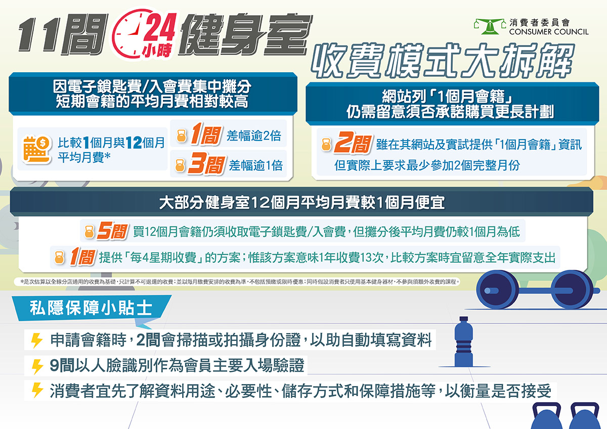 消委會早前調查本港11間24小時健身室,發現收費平均差異較大,其中5間健身室除基本月費外,還另收入會費、電子鎖匙或匙卡費等等,會推高平均月費。此外,健身室在免費試用或開設會籍時均要求消費者提供較敏感的個人資料,部份健身室以人臉識別作為主要入場驗證方式,購買會籍時需要拍攝面部或半身影像。消委會提醒,商戶在收集及處理個人資料時須遵循「必須而不超乎適度」的原則,以符合《個人資料(私隱)條例》的要求。另外,消委會今年頭2個月收到49宗有關24小時健身室的投訴。