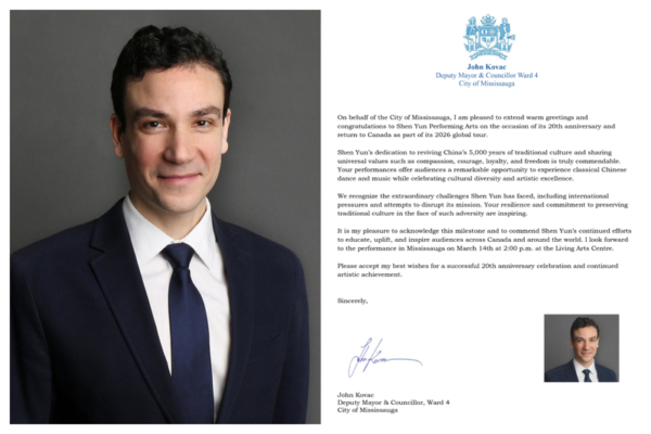 2026年3月14日下午,美國神韻國際藝術團在加拿大密西沙加表演藝術中心(Living Arts Centre)的首場演出爆滿。安省省議員及密市的市長、副市長、市議員紛紛發來賀信恭賀神韻藝術團成立20周年,更有政要親臨劇院觀賞演出並頒發褒獎。