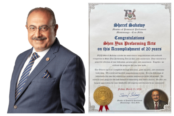 他說,「我很高興能夠見證這一里程碑,我要讚揚神韻藝術團的持續努力,感謝你們持續不斷地為加拿大乃至世界各地的觀眾帶來靈感和啟迪!」