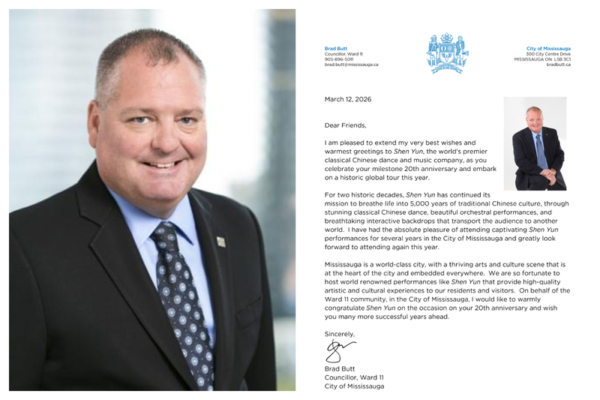 密西沙加市議員Brad Butt在褒獎函中寫道, 「過去20年中,神韻始終秉承著承傳五千年中華傳統文化的使命,通過精湛的中國古典舞、優美的交響樂演奏,令人歎為觀止的互動式天幕背景,將觀眾帶入了另一個世界。」