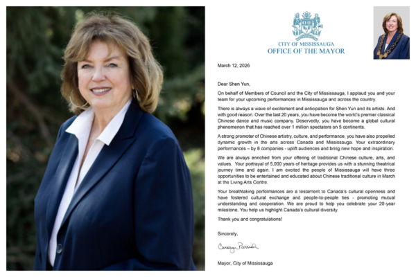 「(神韻)對五千年歷史的演繹,一次又一次地為我們帶來震撼人心的戲劇之旅。」Parrish市長表示,「密西沙加民眾能有機會一睹神韻風采、一睹中華傳統文化之精髓,讓她倍感欣喜。」