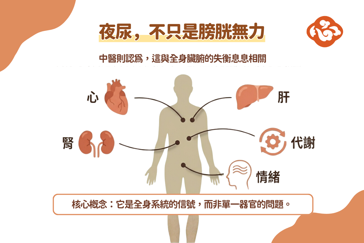 你是否經常有半夜尿意來襲醒來想上廁所,一個晚上好幾次,嚴重影響到睡眠?夜尿症除了是膀胱問題外,還有可能是心、肝、腎的問題。想知道中醫、西醫如何認識夜尿症,以及中醫如何解決夜尿症嗎?本篇將透過中西醫並行的觀點,帶您更完整地理解夜尿的機制與改善方式。