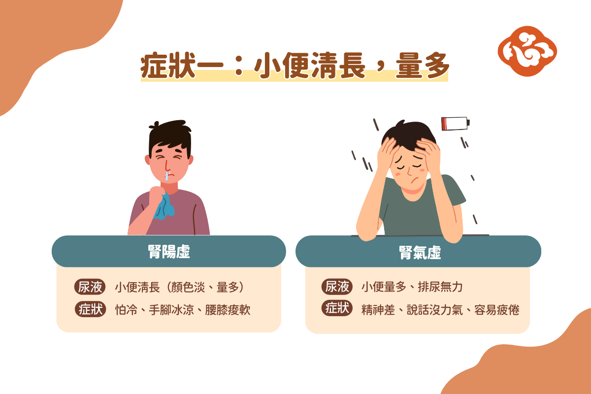 腎氣虛體質:若除了尿量偏多之外,還常覺得精神差、說話沒力氣、容易疲倦,排尿時也感覺使不上力,則較偏向「腎氣虛」或膀胱氣化功能減弱,使膀胱無法順利收攝尿液。