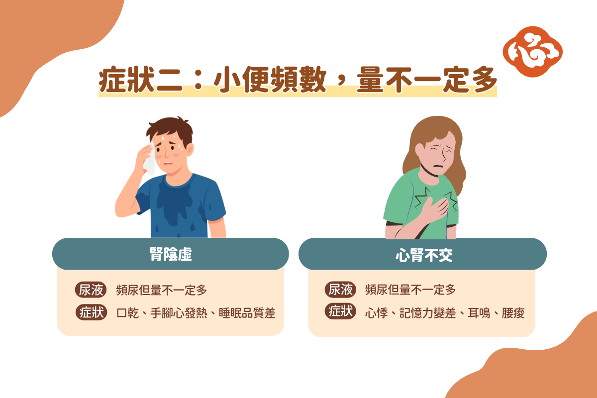 心腎不交體質:若夜尿量不一定多,卻頻頻想上廁所,同時還出現心悸、記憶力變差、耳鳴、腰痠等情況,則較可能是「心腎不交」。