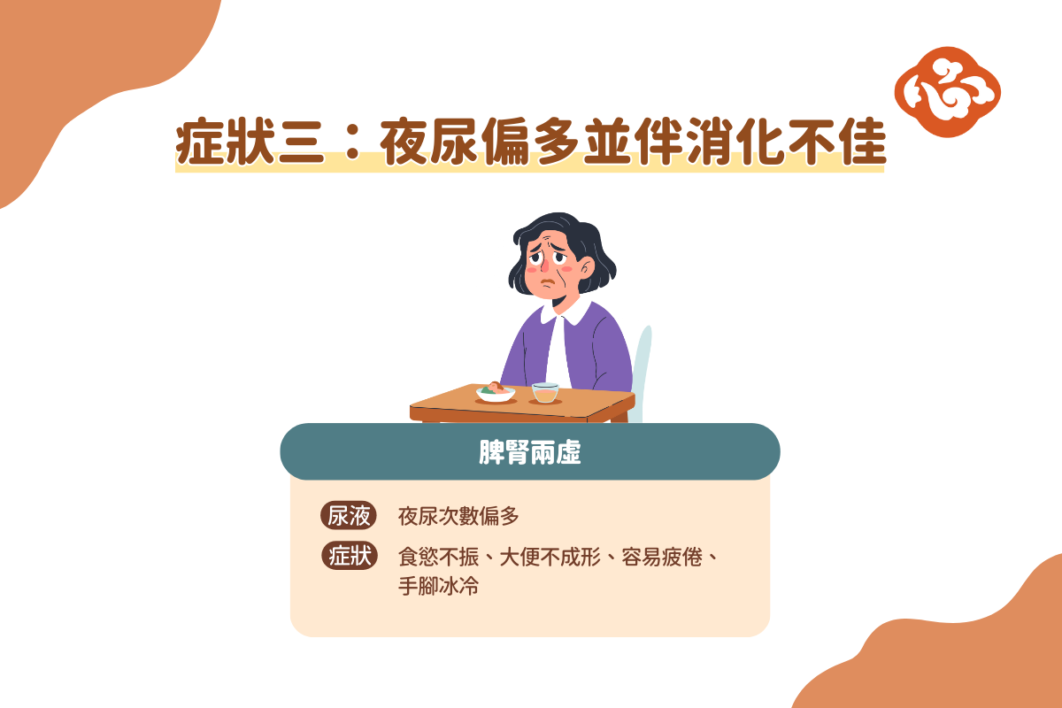脾腎兩虛體質:若夜尿次數偏多,同時常覺得食慾不好、大便不成形、手腳容易冰冷、整個人特別容易疲倦,這類情況多半屬於「脾腎兩虛」。
