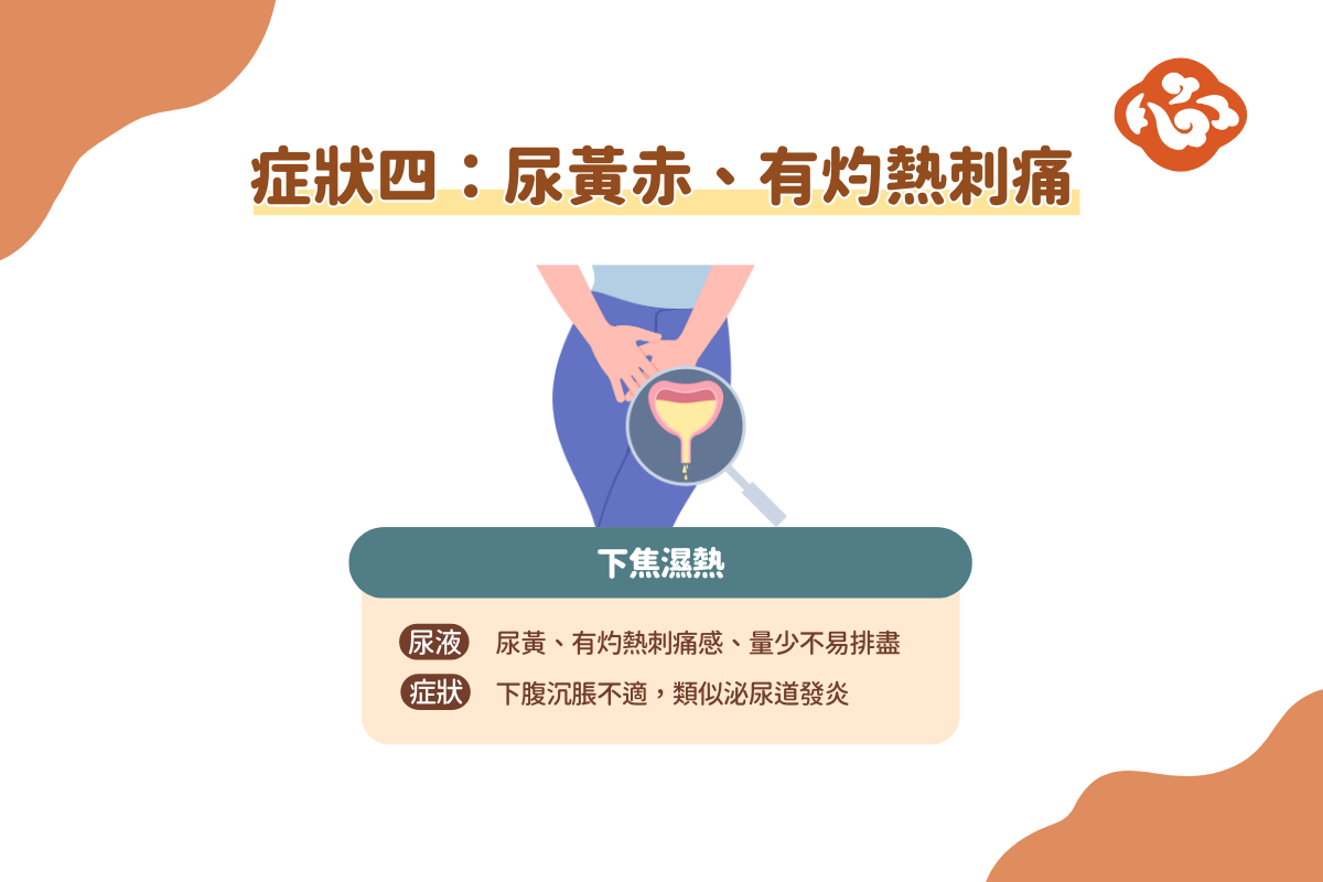 下焦濕熱體質:若出現夜尿急且頻,尿液顏色偏黃,排尿時伴隨灼熱刺痛,小便量少且不易排盡,同時下腹感到沉脹不適,這多半屬於「下焦濕熱」。