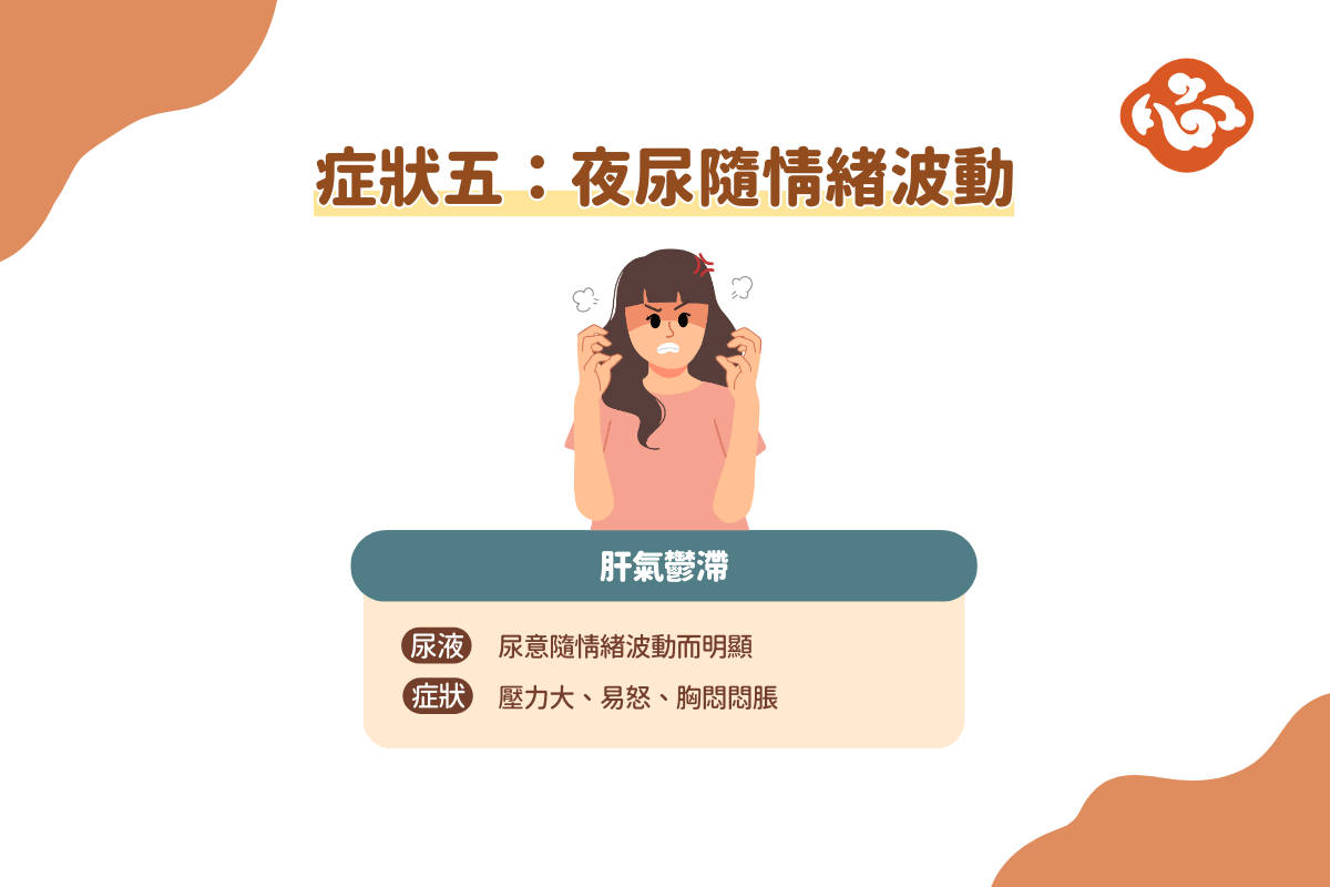 肝氣鬱滯體質:有些人的夜尿會跟情緒變化有關。當壓力大、心情容易煩躁時,常會覺得胸脅悶悶的、比較容易生氣,夜間尿意也特別明顯,這類情況在中醫稱為「肝氣鬱滯」。