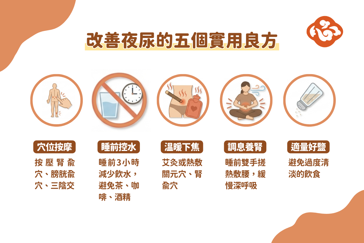 睡前在關元穴附近熱敷10至15分鐘,有助於溫暖下焦並增強固攝作用,使夜間尿意減少。