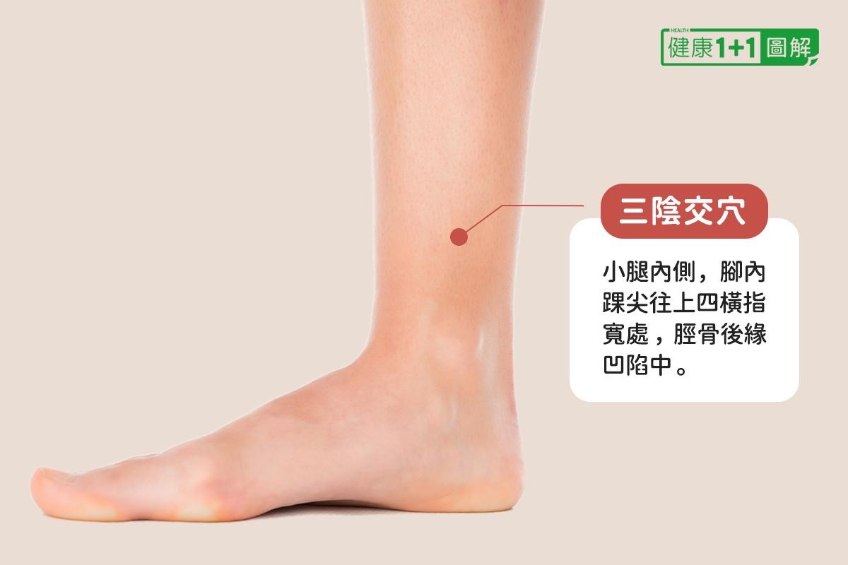 三陰交穴:內踝尖(腳踝最凸起處)上方約四橫指寬,在脛骨後面的凹陷處。