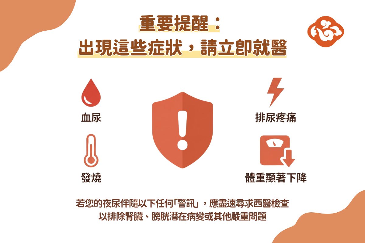 若夜尿同時伴有血尿、排尿疼痛、發燒,或近期體重顯著下降,應盡速至西醫檢查,以排除腎臟與膀胱的器質性病變。