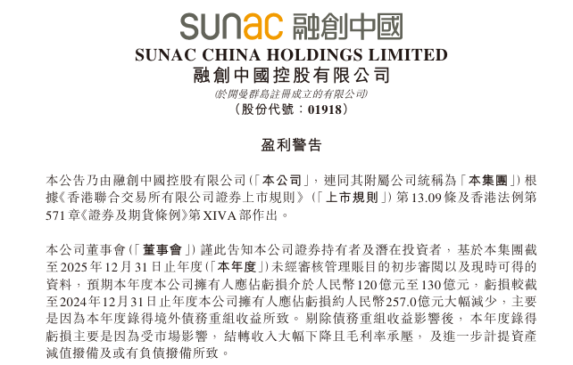 融創中國3月17日發布了《盈利警告》公告。公告「預期本年度本公司擁有人應佔虧損介於人民幣120億元至130億元」。