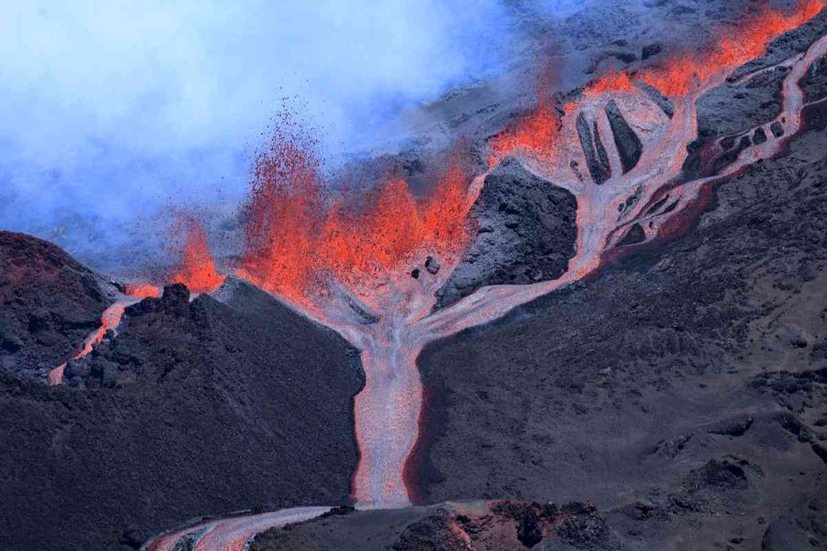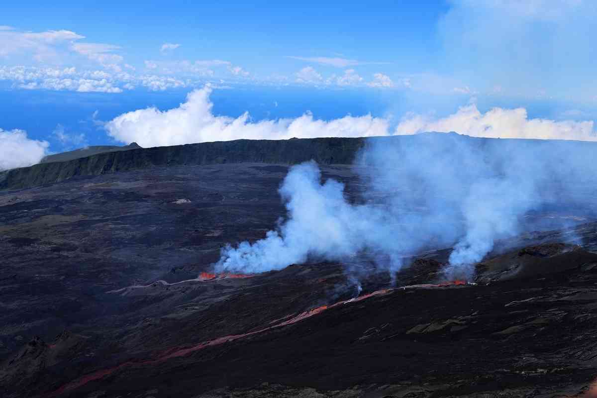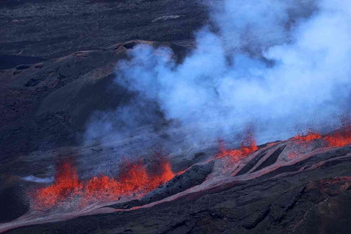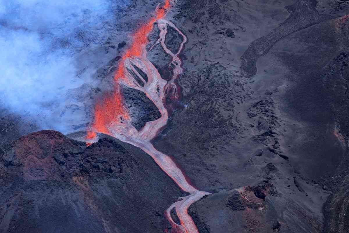 法國海外屬地留尼汪島一座活火山自上月中旬噴發以來,壯觀的熔岩流穿越森林並橫越當地一條主要公路,導致道路被切斷,然後在距離海洋150米處停滯數小時後,於周一(3月16日)最終入海。