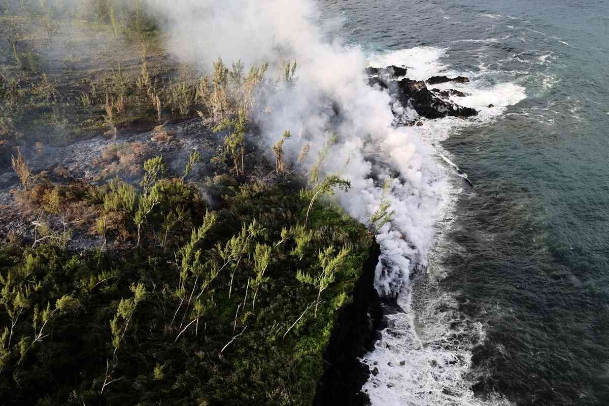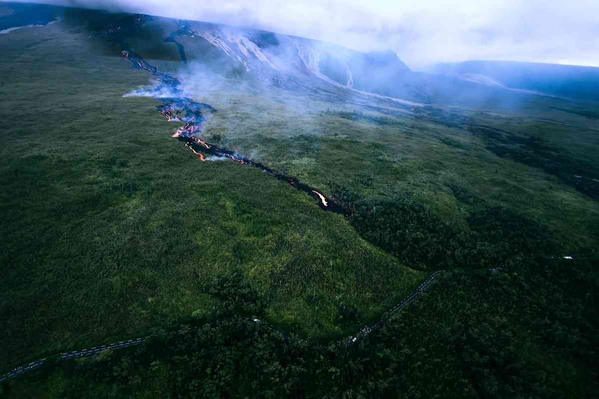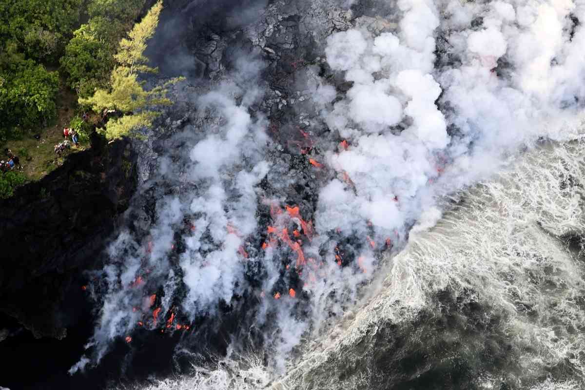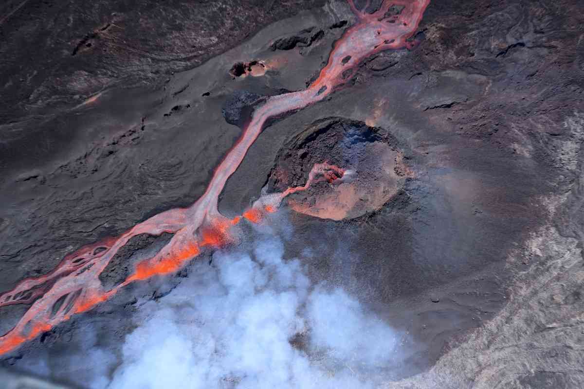 法國海外屬地留尼汪島一座活火山自上月中旬噴發以來,壯觀的熔岩流穿越森林並橫越當地一條主要公路,導致道路被切斷,然後在距離海洋150米處停滯數小時後,於周一(3月16日)最終入海。